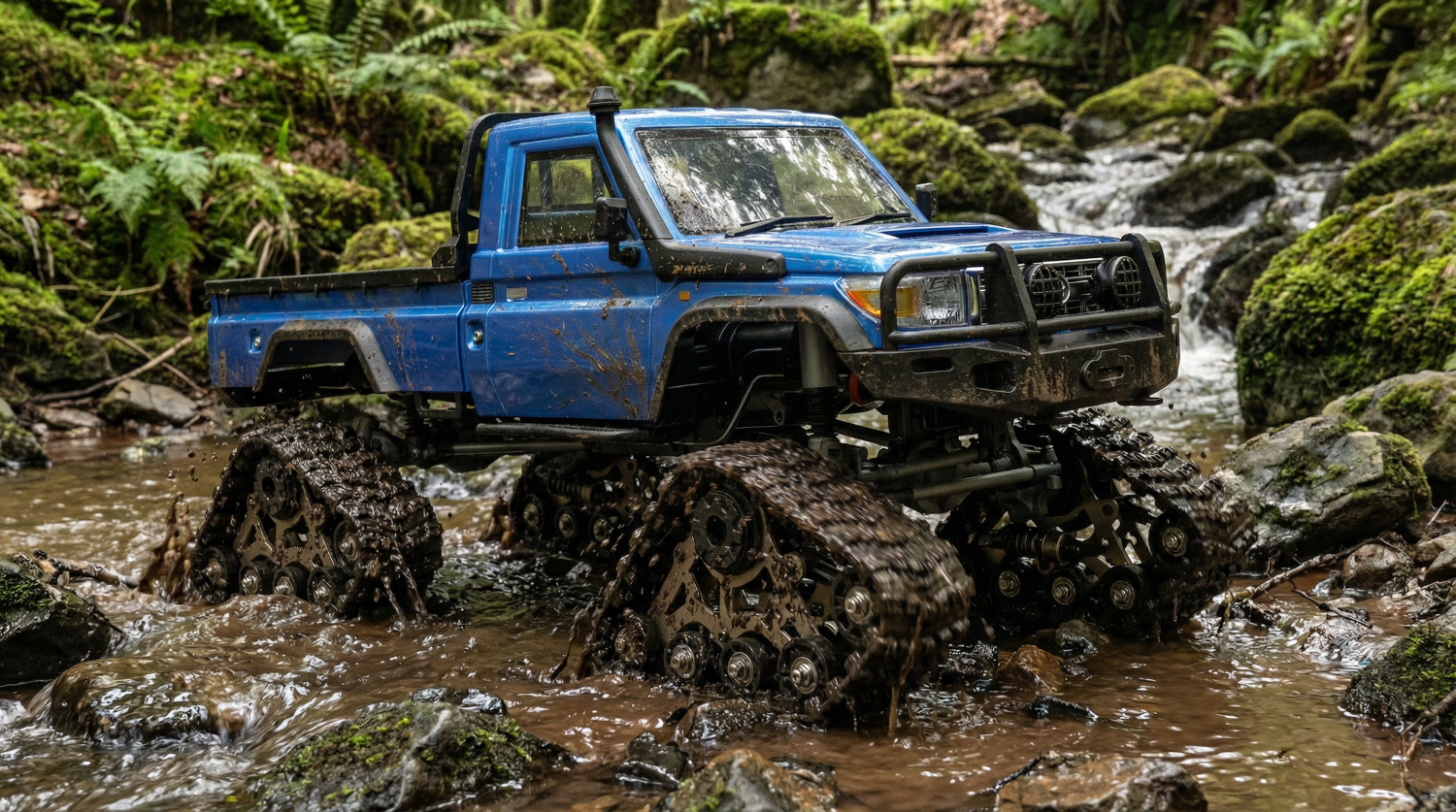 AMXRock RCX10TB (Basic RTR) in blau mit Kettenfahrwerk. Dieser Top Crawler im Maßstab 1:10 vereint super Technik mit genialen Fahreigenschaften. Ausgestattet mit einem massiven 5mm starken Metallrahmen, Portalachsen, Aluminium Streben, hochwertigen komplett geschützten Öldruck Stoßdämpfer, 550er Bürstenmotor, einem gedämpften Lenkungssystem, hochwertigen, einstellbarem Aluminium-Kettenfahrwerk und 2 - Gang Schaltgetriebe lässt diese Fahrzeug kaum Wünsche offen.