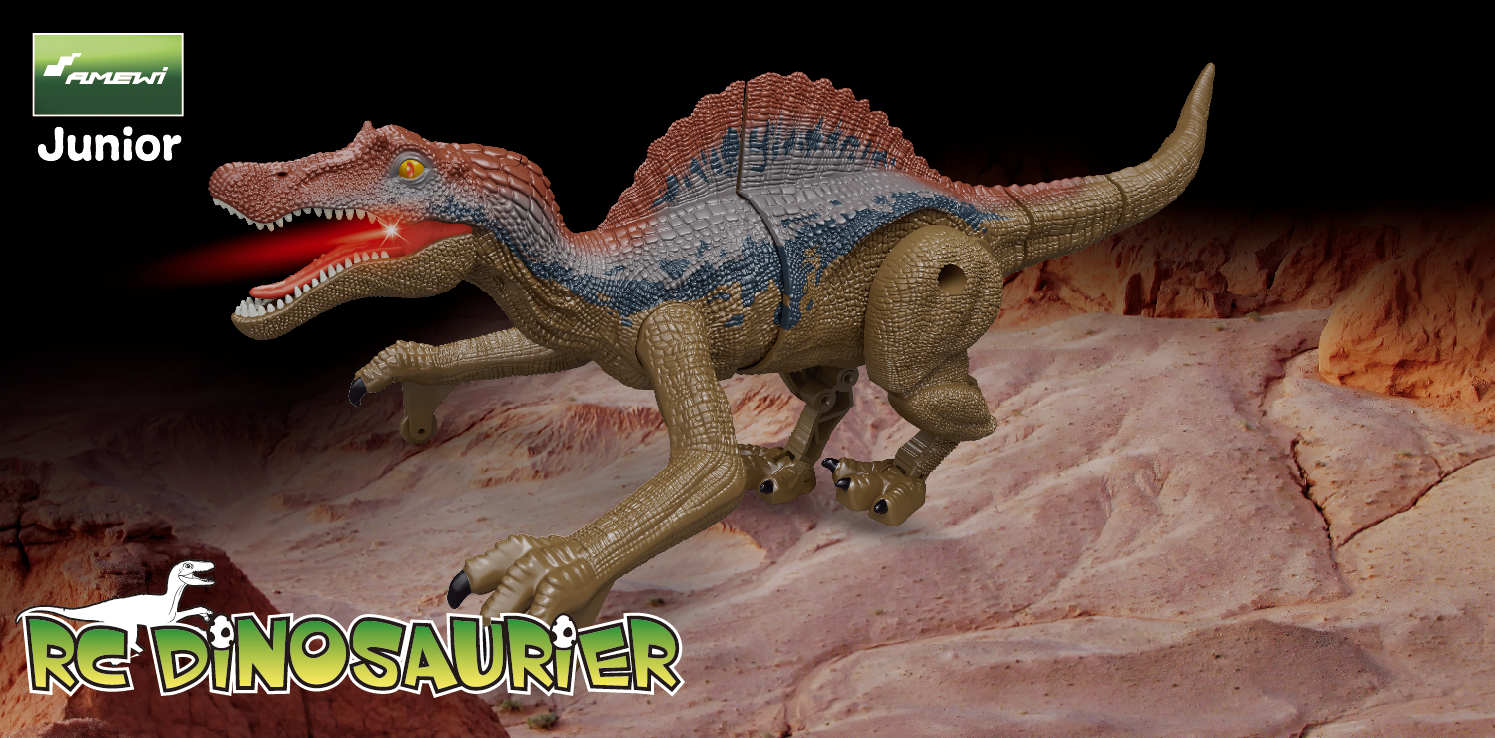 Die Fernsteuerung hat ein cooles fossiles Design und ist einfach für Kinder zu bedienen. Sie ermöglicht auch ein reibungsloses Spielen mit mehreren Dinosauriern gleichzeitig. Als Ready-to-Run-Version wird der Spielzeug-Dino geliefert und enthält bereits alles, was für die Inbetriebnahme benötigt wird, außer den handelsüblichen Batterien für die Fernbedienung. Lade einfach den integrierten Akku im Modell schnell mit dem USB-Kabel auf, und schon kann der Spaß beginnen. Zum Leben erweckt wird der Spinosaurus per Knopfdruck, der sich auf dem Kopf befindet.