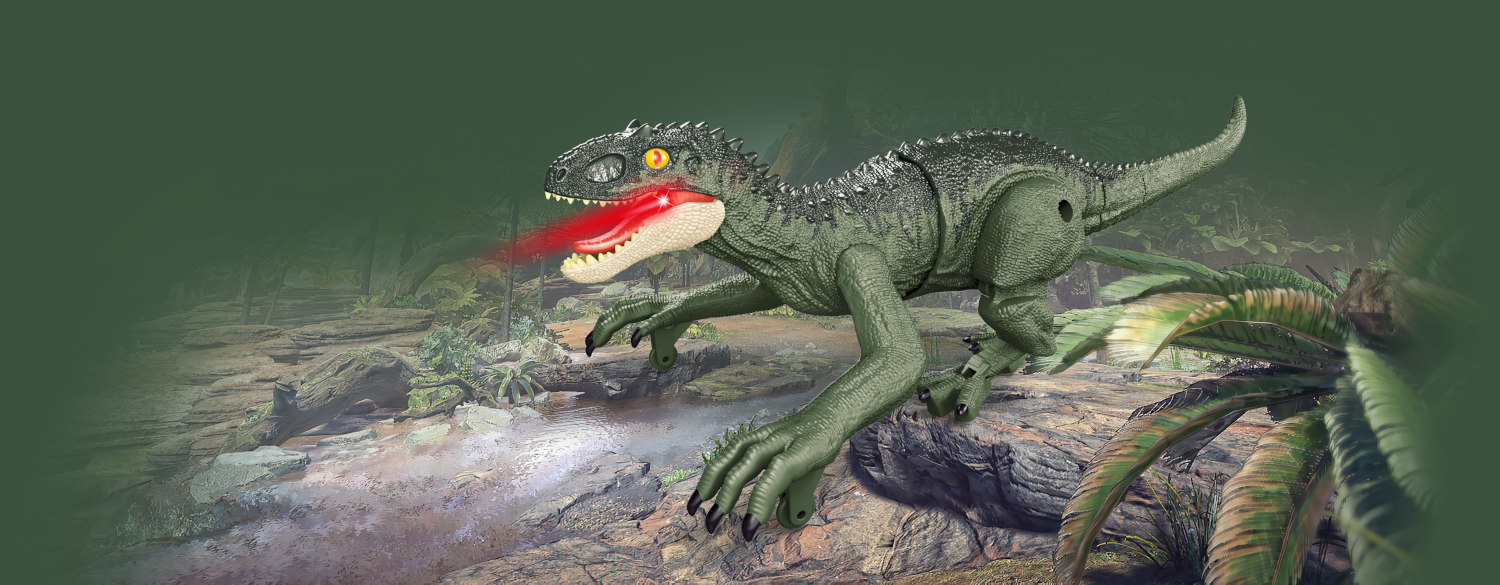 Charakteristische Zähne, mächtige Krallen und die detailreiche Schuppentextur auf dem muskulösen Körper verleihen diesem Herrscher der Kreidezeit ein lebensechtes Aussehen. Darüber hinaus sorgt das LED-Licht im Maul für einen aufregenden Effekt. Der Mini-Tyrannosaurus bewegt sich in alle Richtungen und mit seitlichen Schwingungen über den Boden. Auf Knopfdruck kann er zusätzlich furchteinflößend brüllen. Kleine Räder unter den Vorderbeinen sorgen für hohe Stabilität beim Gehen, während die flexiblen Hinterbeine mit gummierten Füßen an der Unterseite für besten Halt sorgen. Und das Beste daran ist: Im Demo-Modus führt der ferngesteuerte Raptor alle Aktionen vor, die die Kinder dann selbst ausprobieren können.